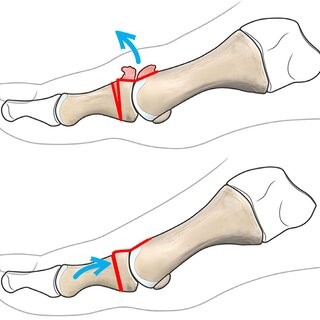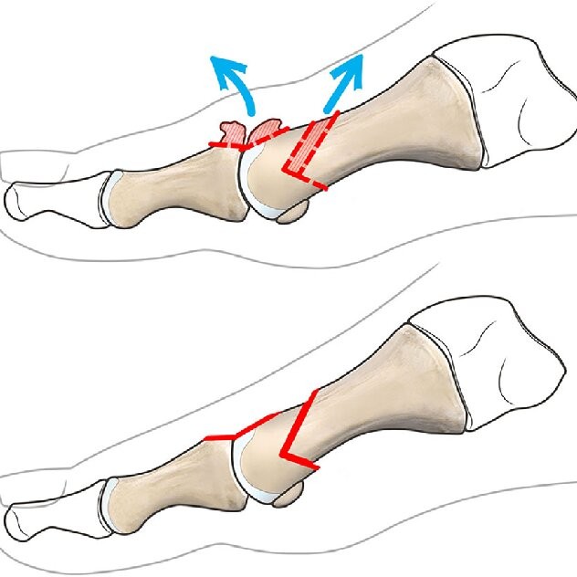 Dorsale Keilentnahme am Grundglied zur Verbesserung der Dorsalextension; ergänzend zur Cheilektomie bei eingeschränkter Hochbewegung.