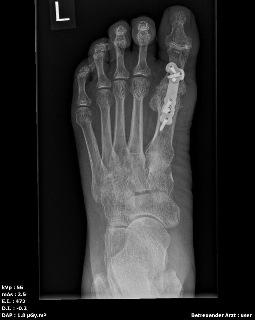 - Spezialsprechstunde Fußchirurgie: langjährige Erfahrung mit Vorfuß-OPs (Hallux rigidus/valgus, Arthrosen, komplexe Fehlstellungen)
