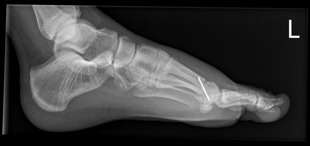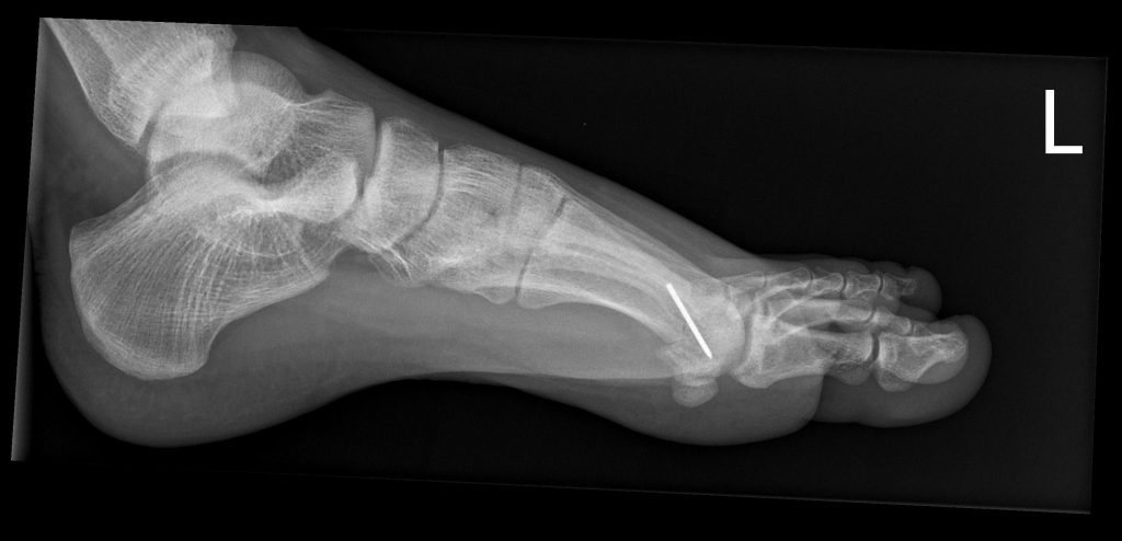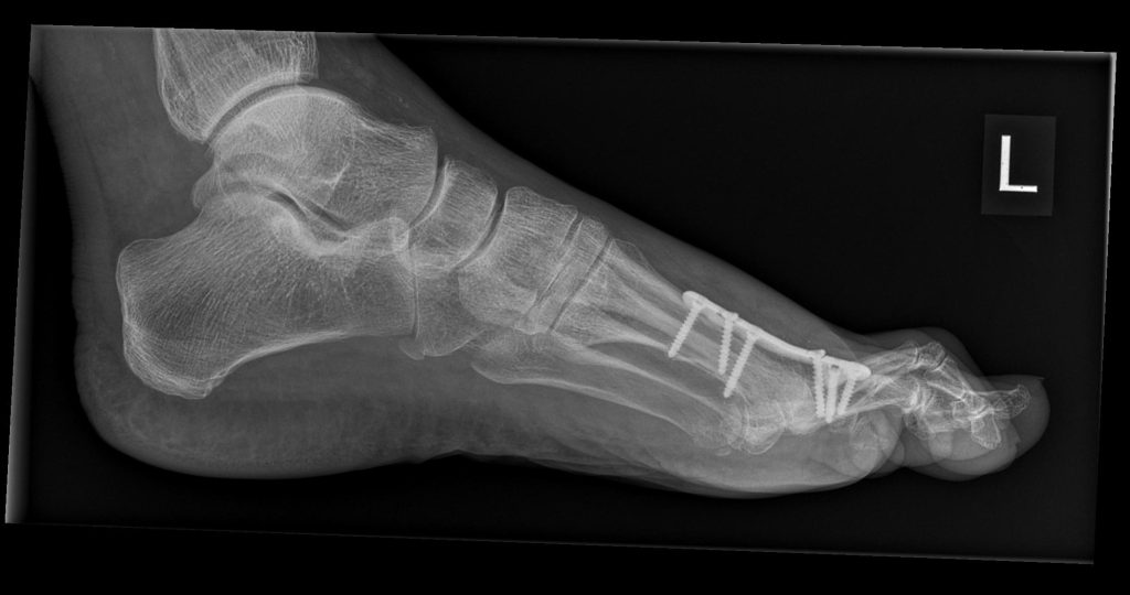 Versteifung des Großzehengrundgelenks in funktioneller Position. Sehr verlässliche Schmerzausschaltung auf Dauer, stabiles Abrollen, gute Belastbarkeit im Alltag und für viele Sportarten.